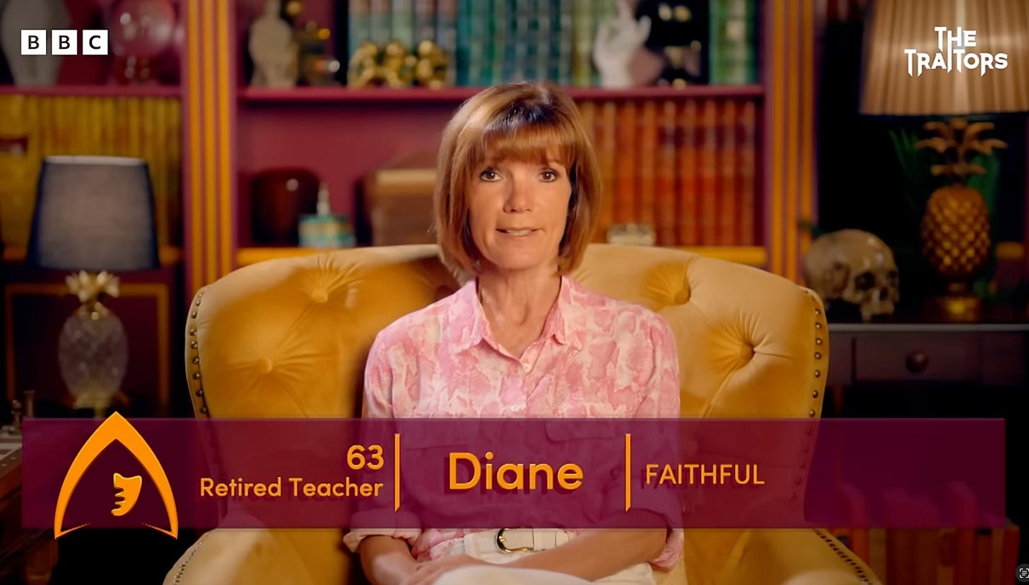 [PICTURE] In one of the biggest “jaw-drop” moments of recent UK reality TV history, what three words complete this quotation from season 2 of The Traitors, where Diane privately addressed her fellow contestants’ speculations about her possible covert connection to another contestant: “Paul just couldn’t be my son …”?